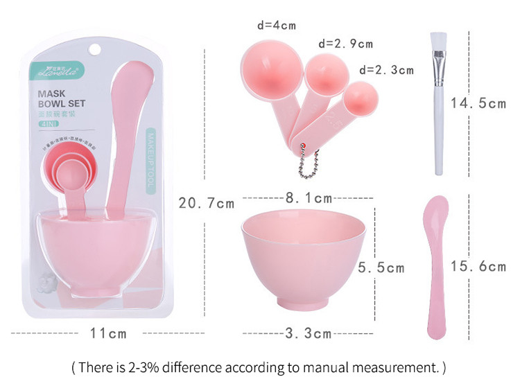 Material: plastic Color: Pink, yellow, green, blue Size: bowl: diameter 8cm, high4.8cm, brush length: 14cm, bar: 14.4cm. Package includes: 1 * bowl 1 * brush 1 * bar 1 * spoon kit