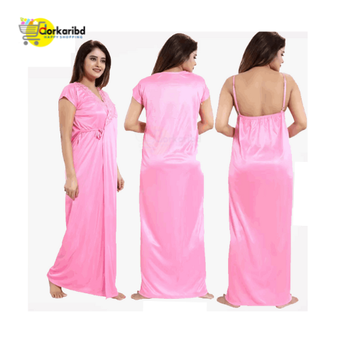 4-Part Long Solid Night Dress Set A Fashionable and Comfortable Choice for Nighttime Wardrobe Color Family- pink