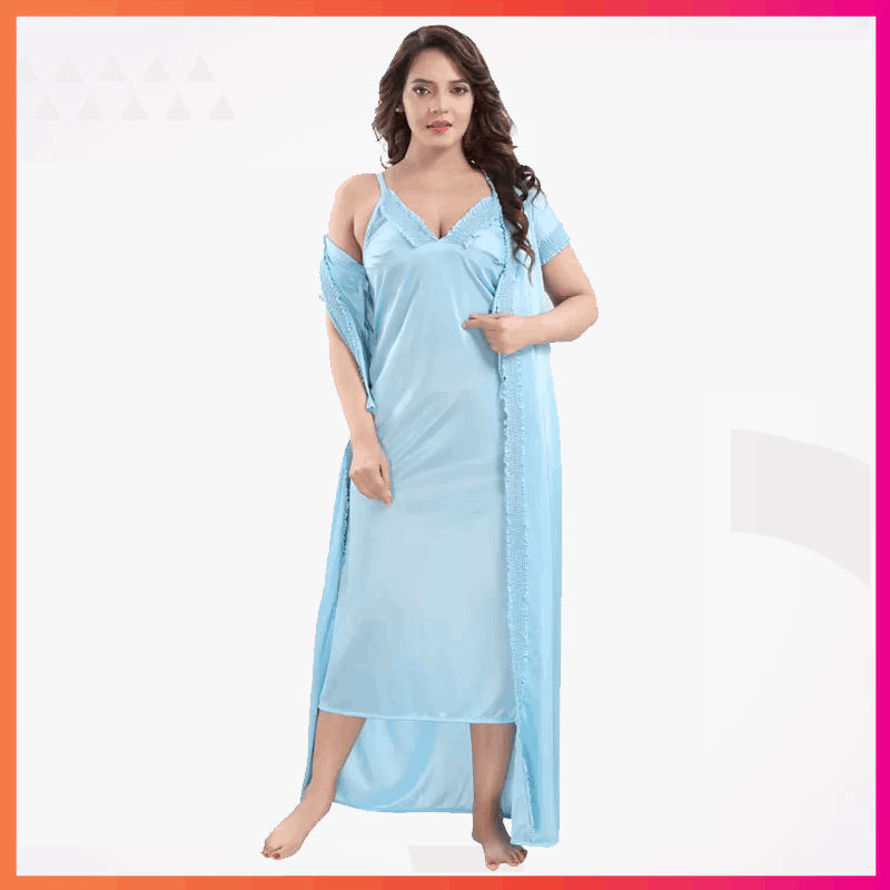 2-Part Long Solid Night Dress Set A Fashionable and Comfortable Choice for Nighttime Wardrobe Color Family- Sky Blue