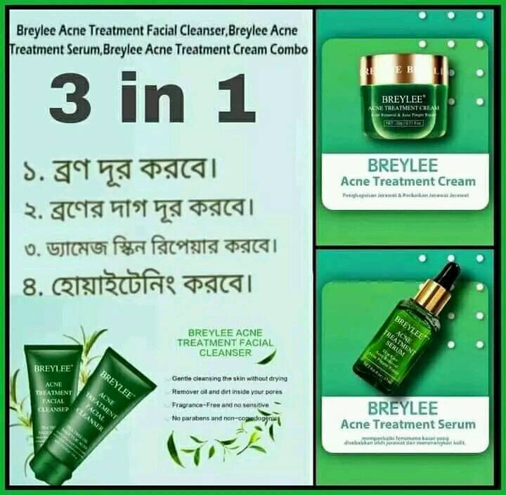 Breylee Acne &Pimples Treatment Cream. যাদের ত্বকে ব্রণ এর সমস্যা আছে এই ক্রিম টা তাদের জন্য। এই ক্রিম এর উপকারিতা হল : ব্রণের ব্যাকটেরিয়া মেরে ফেলে। ব্রণের দাগ হালকা করে। পোরস মিনিমাইজ করে। ড্যামেজ স্কিন রিপেয়ার করে। ব্যবহারবিধি : মুখ ফেসওয়াস দিয়ে ধুয়ে পরিষ্কার করে আঙ্গুলের সাহায্যে আপনার মুখে যেখানে পিম্পল আছে সেখানে উপযুক্ত পরিমাণে ক্রিম লাগান। ত্বকে মিশে না যাওয়া পর্যন্ত আলতো করে ম্যাসাজ করুন। দিনে দুবার অর্থাৎ সকাল এবং রাতে ব্যবহার করতে পারেন।